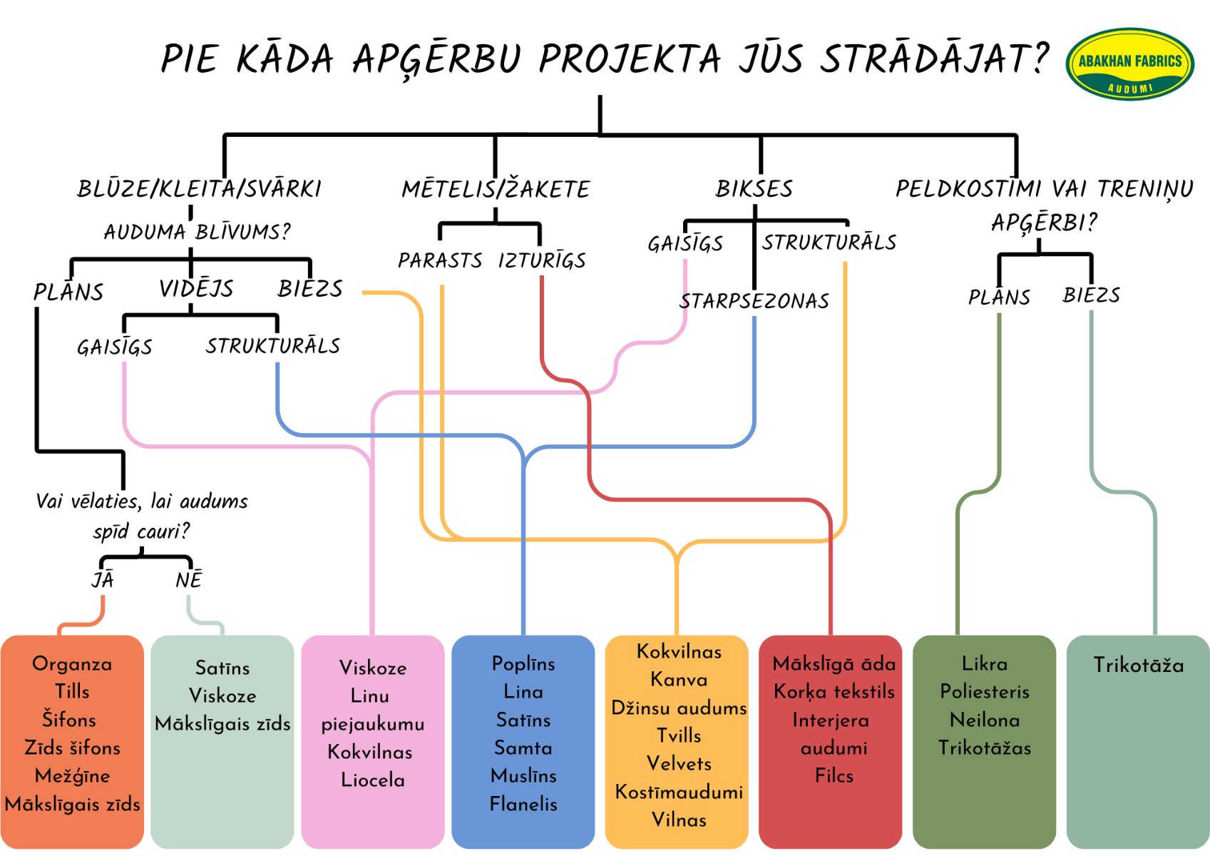Tas pats princips attiecas uz blūzēm un svārkiem – audums jāizvēlas atbilstoši vēlamajam piegriezumam un stilam.