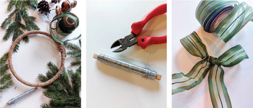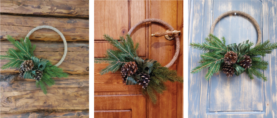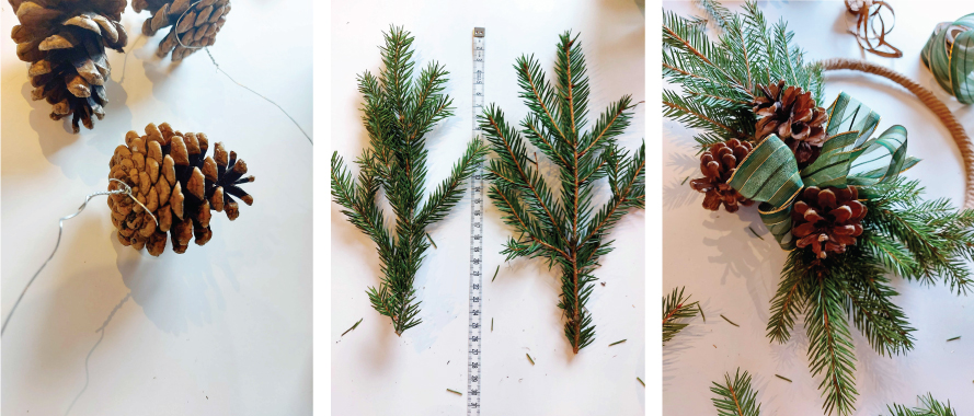 - Šajā darbā gredzena piekarināšanas cilpa ir paslēpta zem egles mezgla, taču to var arī atstāt ārā, lai vainagu pakarinātu.