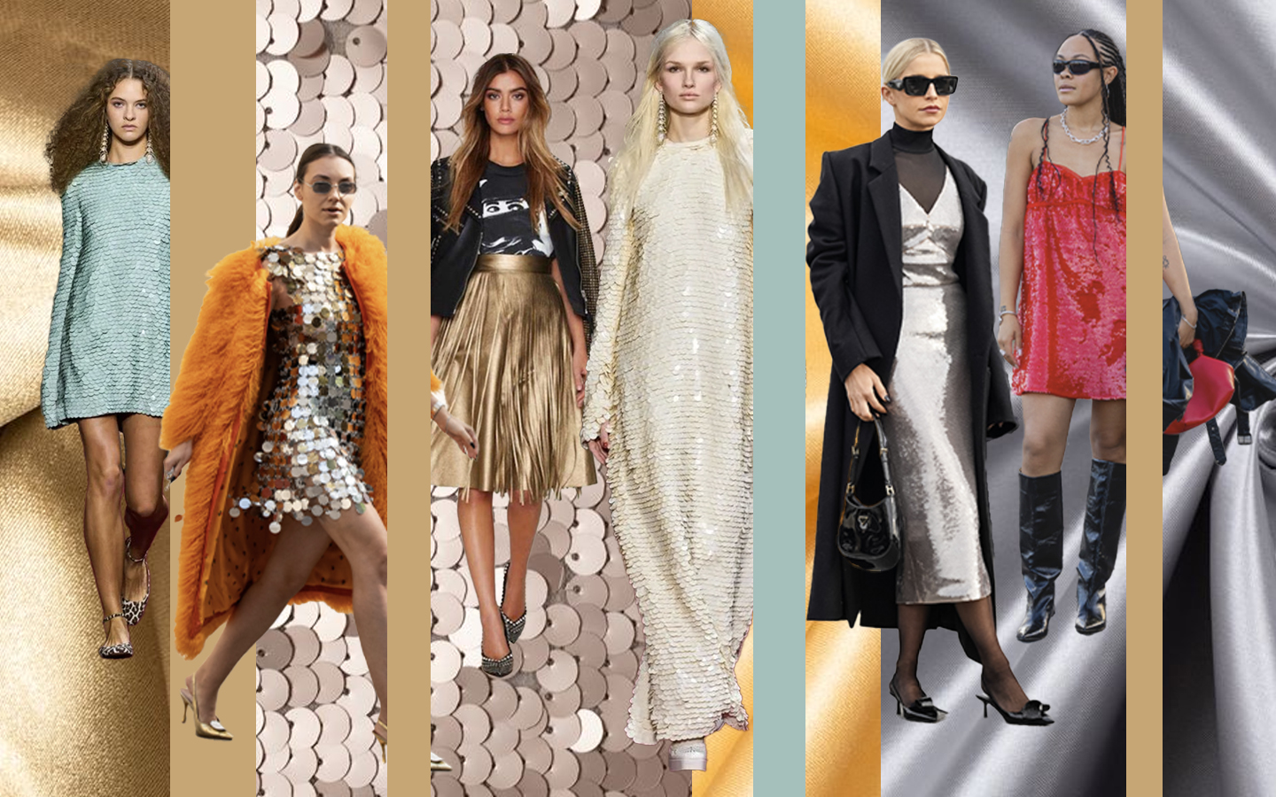 Vakartērpus un svinību apģērbu var paspilgtināt ar metāliskiem toņiem un fliteriem. Zeltīti un sudraboti audumi piešķir greznu un glamūru izskatu – vai tā būtu kleita vai žakete.