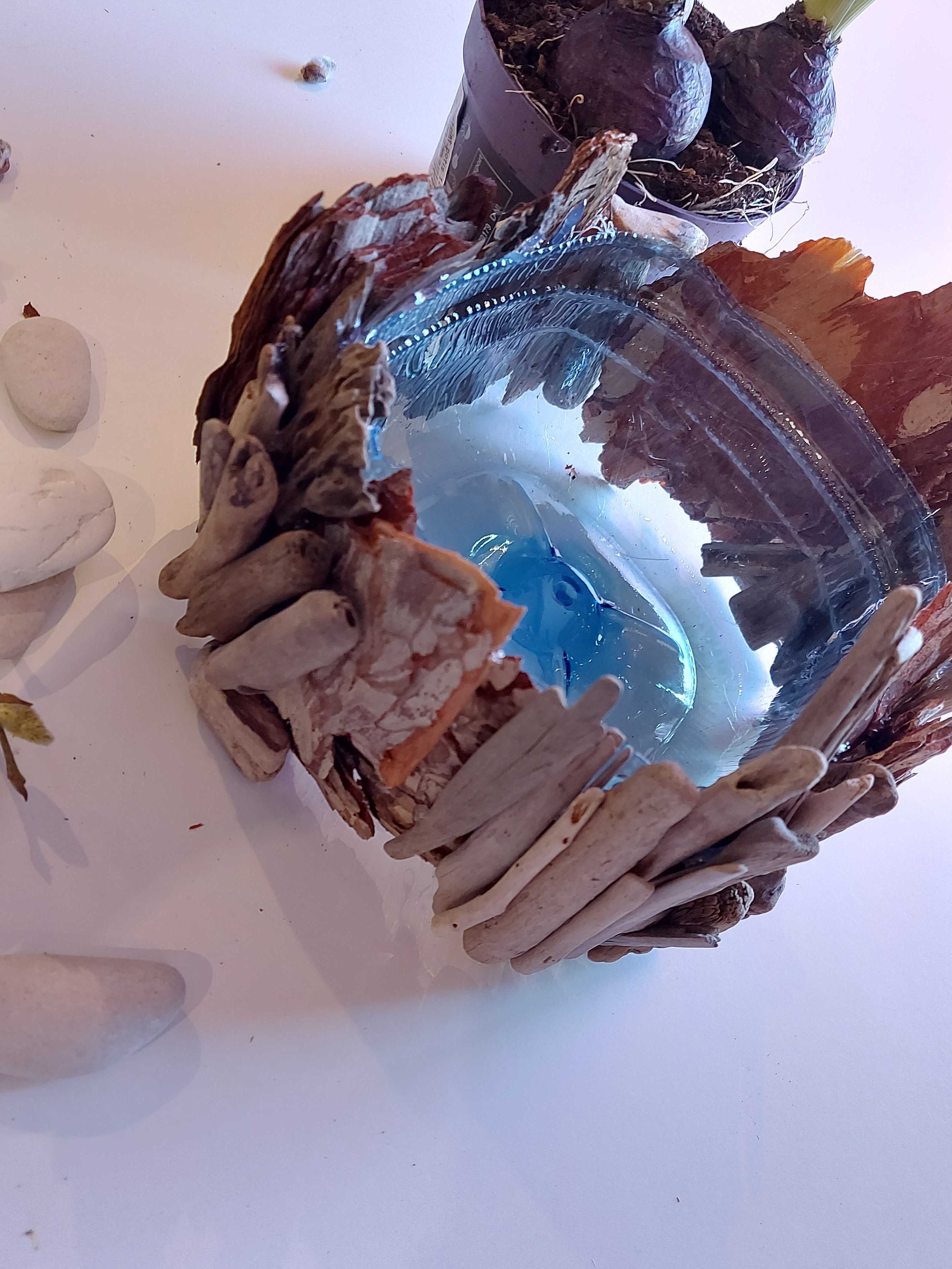 - First, cover the base with wood chippings and pieces of bark. They stay in place very well when using hot glue.