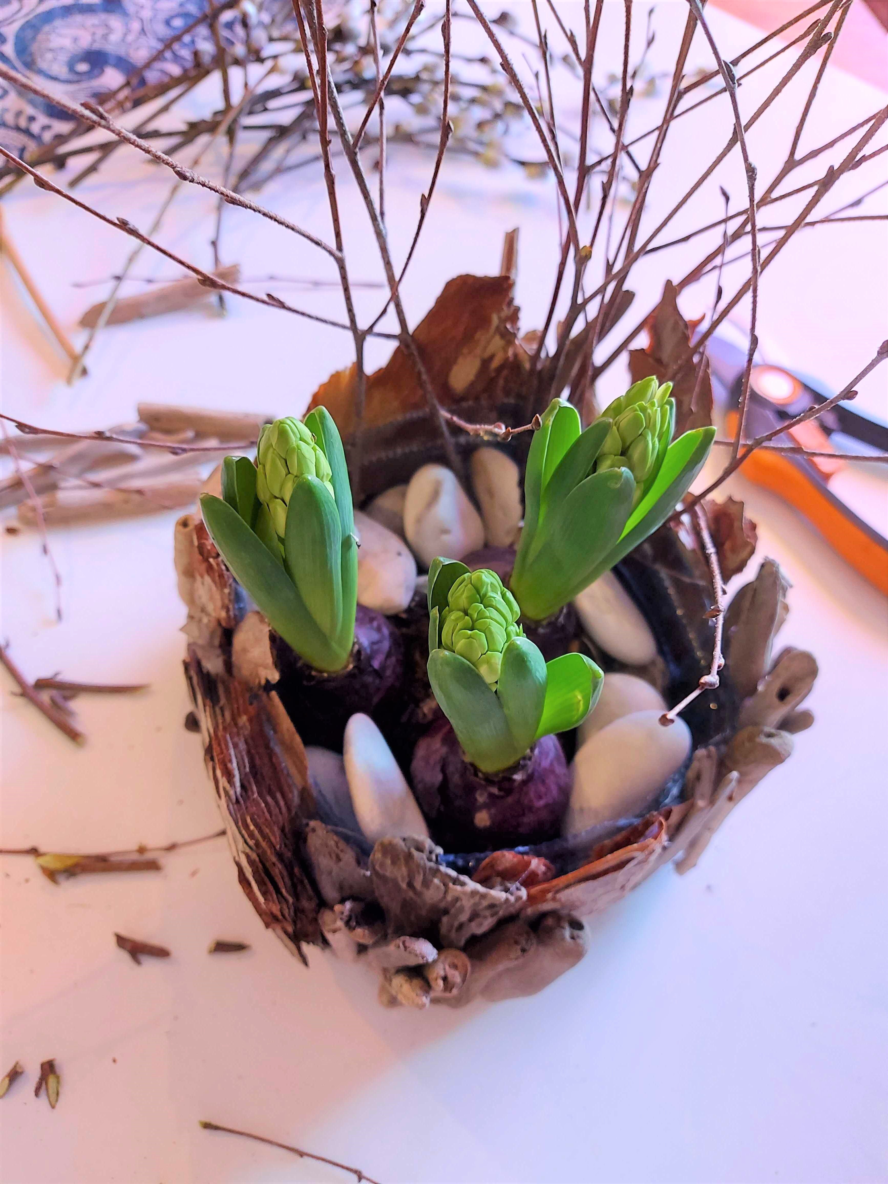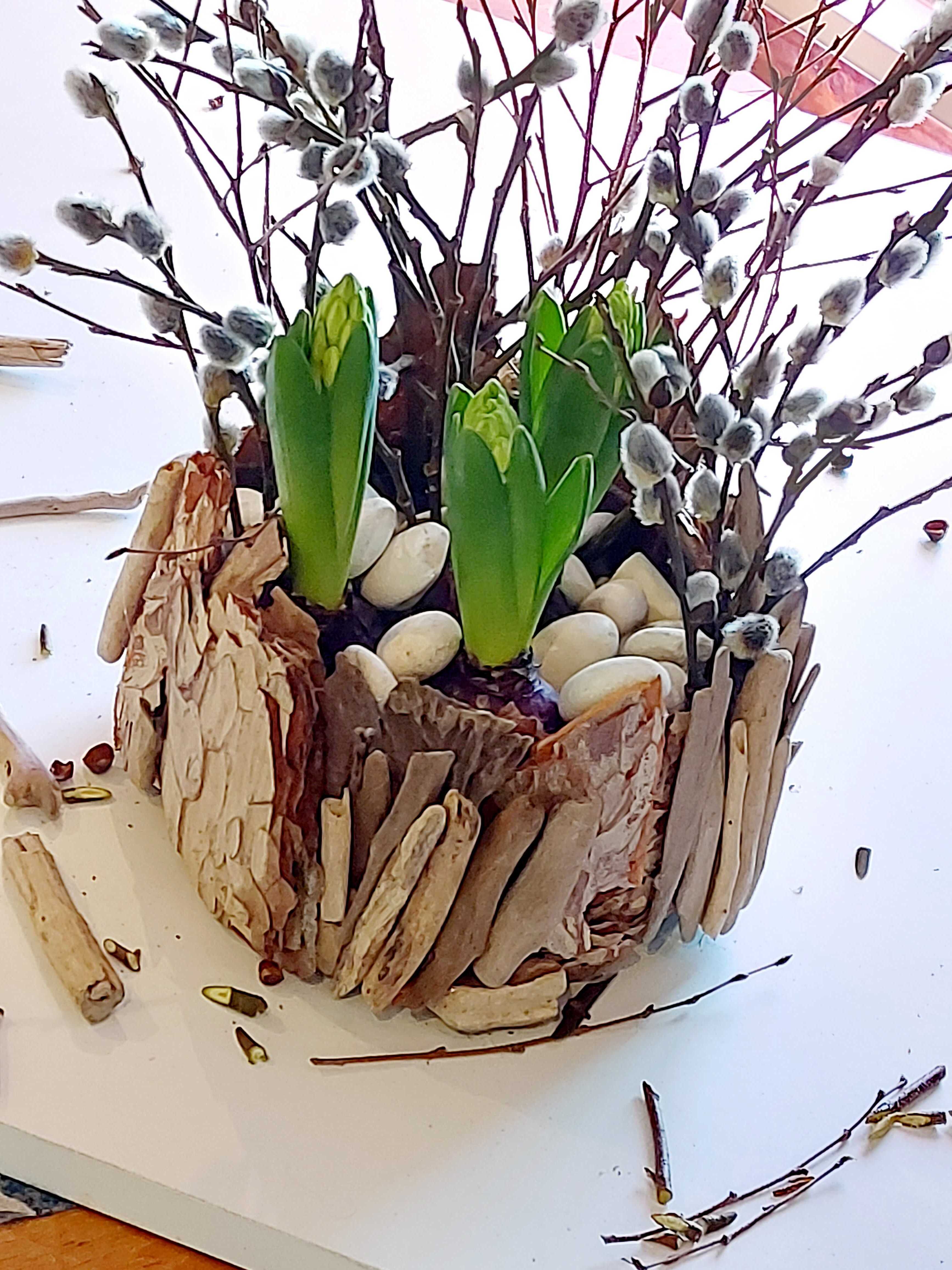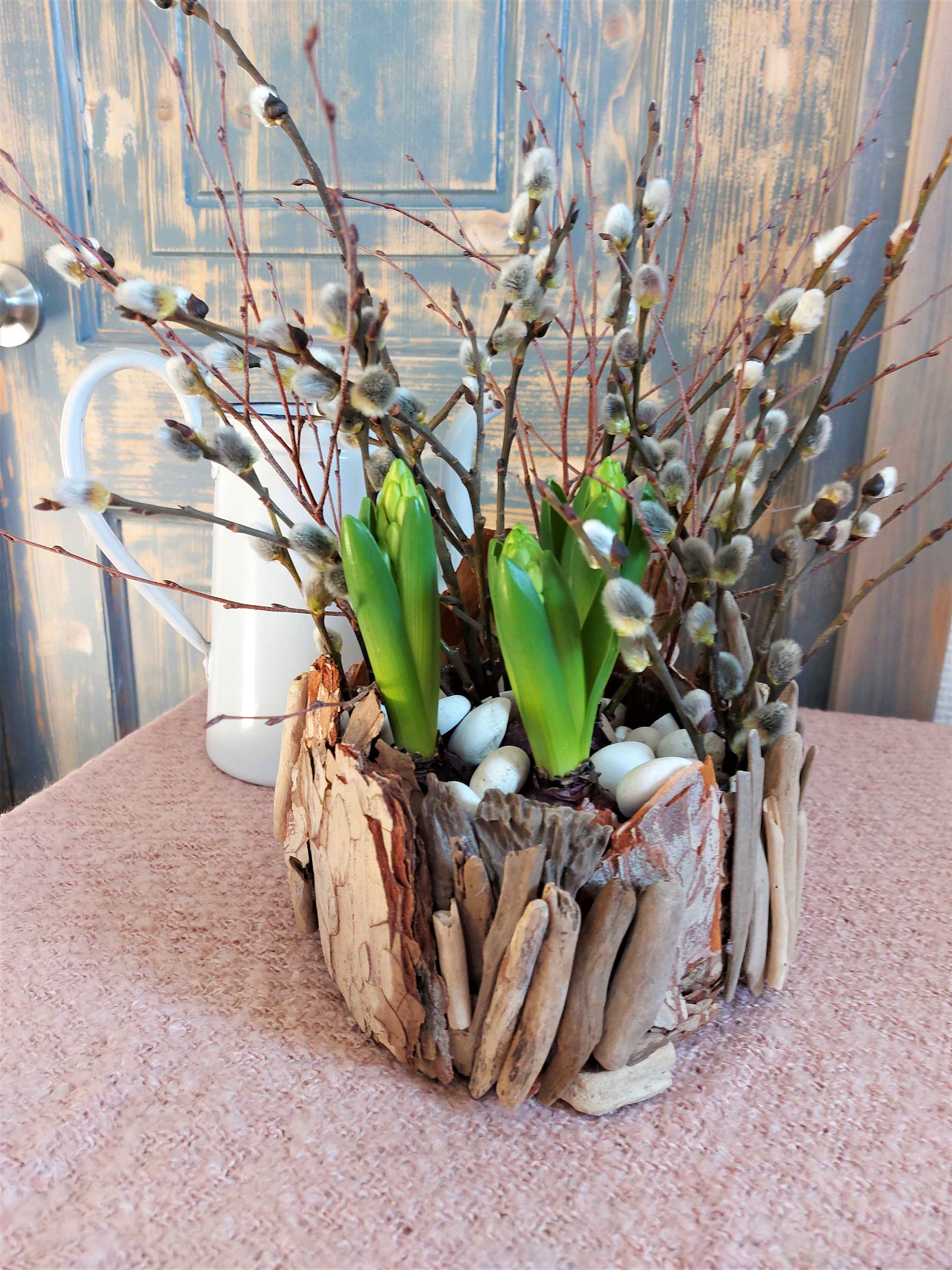 - Tuck different branches between the stones. Willow branches with flowers are especially nice. The branches act as a support for the flower stems as they quickly grow in height in a warm room.