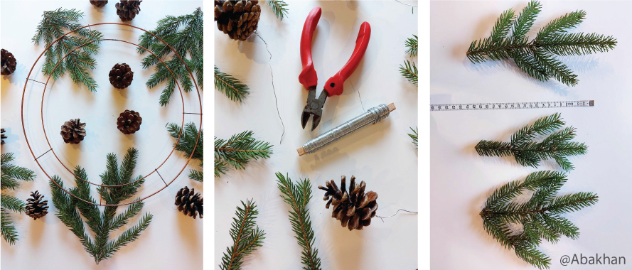 - Start working from the outer circle. Fasten the end of the wire to the ring with a few circles, and start twisting on the frame in a two-by-two huddle of the spruce branches. A couple of circles should hold the bundle firmly. Make sure that the twigs are secured with sufficient strength. Each next pair must surely cover the previous attachement point. Stack the bundles on top of each other in just the right number of steps for the amount of fluff you want and the amount of material you have.