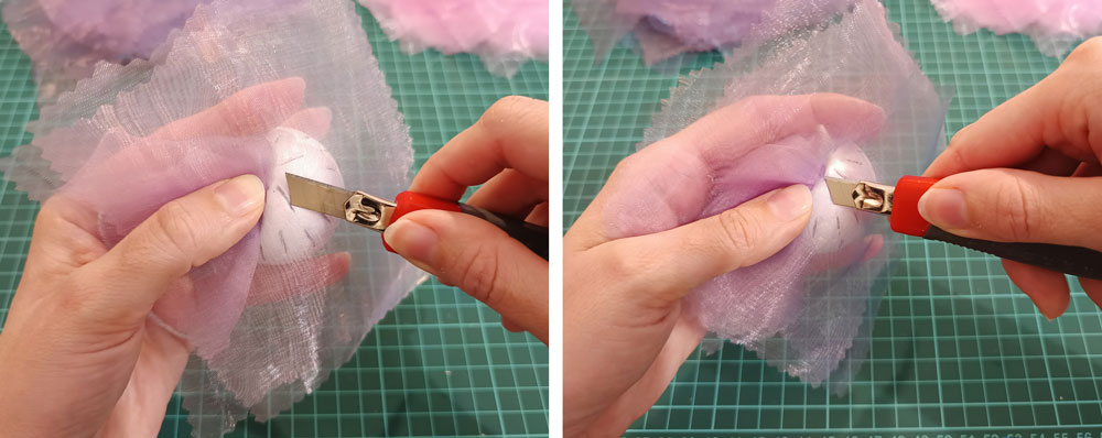 - Аккуратно сделайте надрезы в отмеченных местах. Избегайте слишком частых прорезов, чтобы шар не стал ломким.