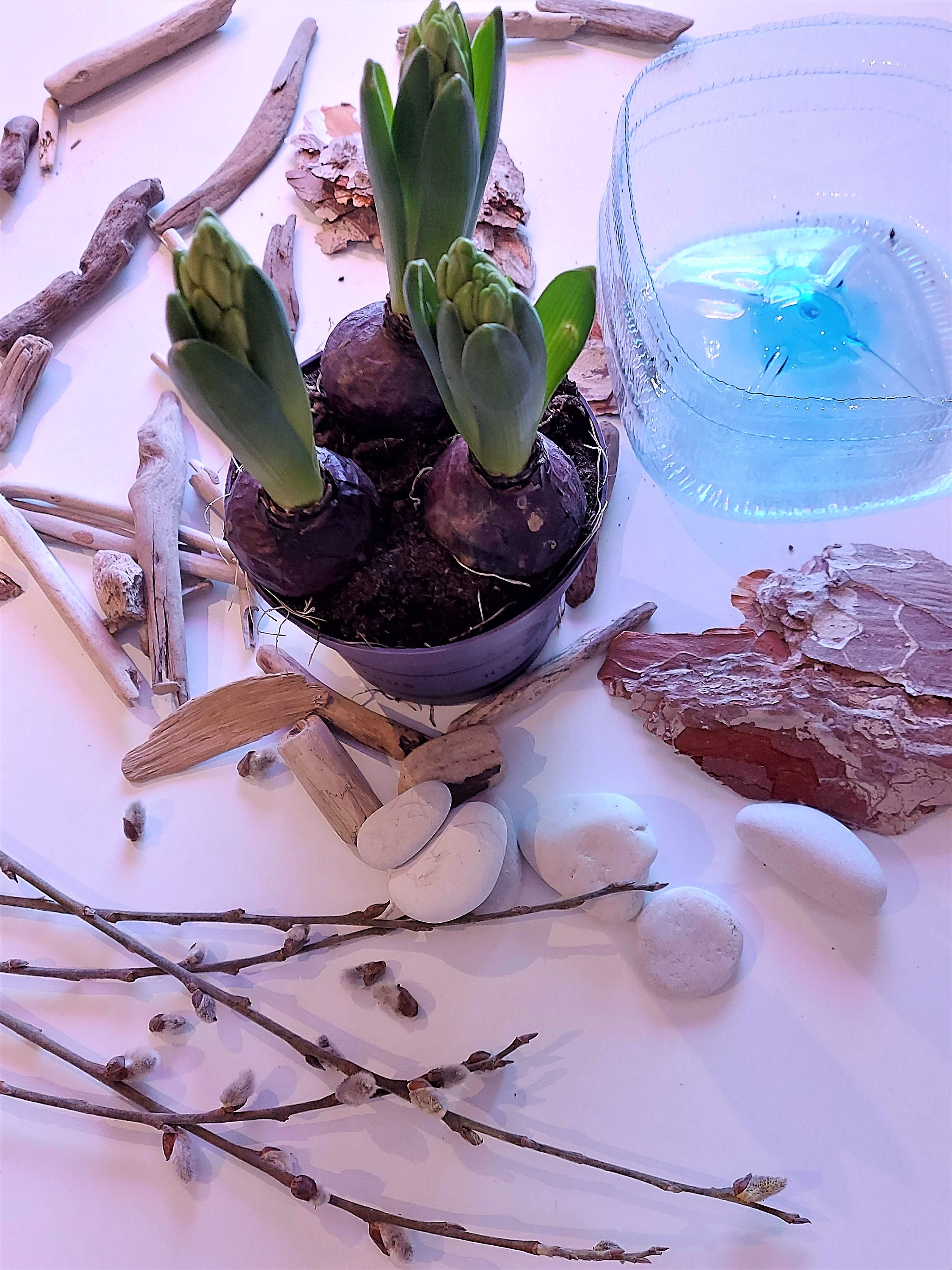 * Между камнями вставьте различные веточки. Особенно хорошо будут смотреться веточки вербы. Ветви помогут быстро подросшим в теплой комнате цветам, оставаться в вертикальном положении.