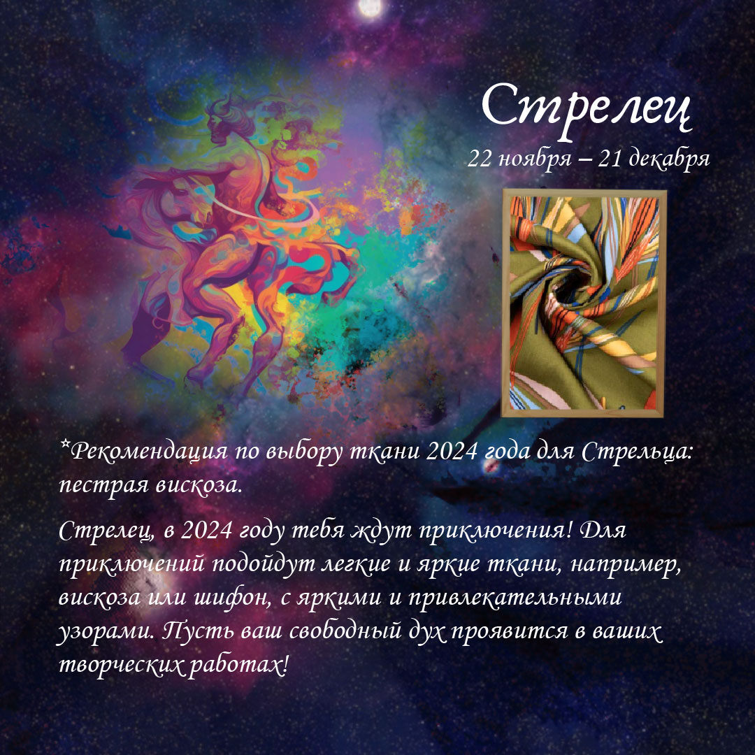 Стрелец, в 2024 году тебя ждут приключения! Для приключений подойдут легкие и яркие ткани, например, вискоза или шифон, с яркими и привлекательными узорами. Пусть ваш свободный дух проявится в ваших творческих работах!