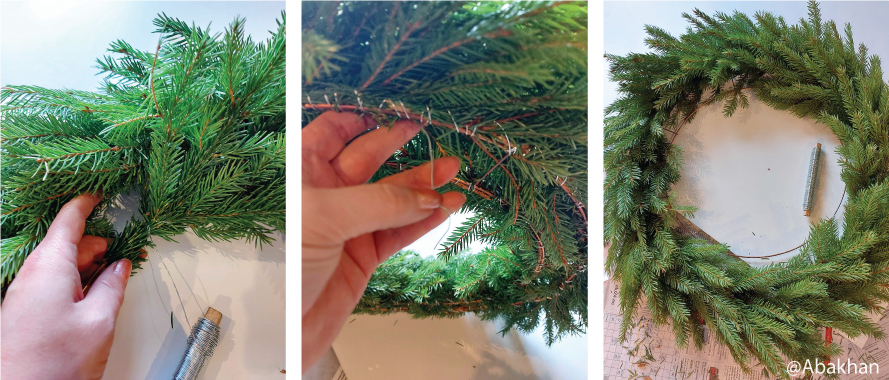 - Начните работу с внешнего круга. Присоедините конец проволоки к кольцу несколькими витками и начните попарно вплетать в каркас еловые ветки. При помощи пары витков проволокой букет из веточек должен крепко держаться. Убедитесь, что веточки достаточной прочно прикреплены. Каждая последующая пара должна перекрывать предыдущую точку крепления. Устанавливайте букеты из веточек друг на друга так плотно, насколько пушистый венок вы хотите получить, и сколько материала вы можете использовать.